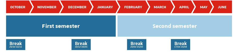 The academic year is structured into two semesters (October–January and February–June). In the 24-month track, the 411 hours are distributed across four semesters instead of two, significantly offering a lighter weekly workload. Live sessions follow the standard university calendar, including a winter break in December and a spring break in April.